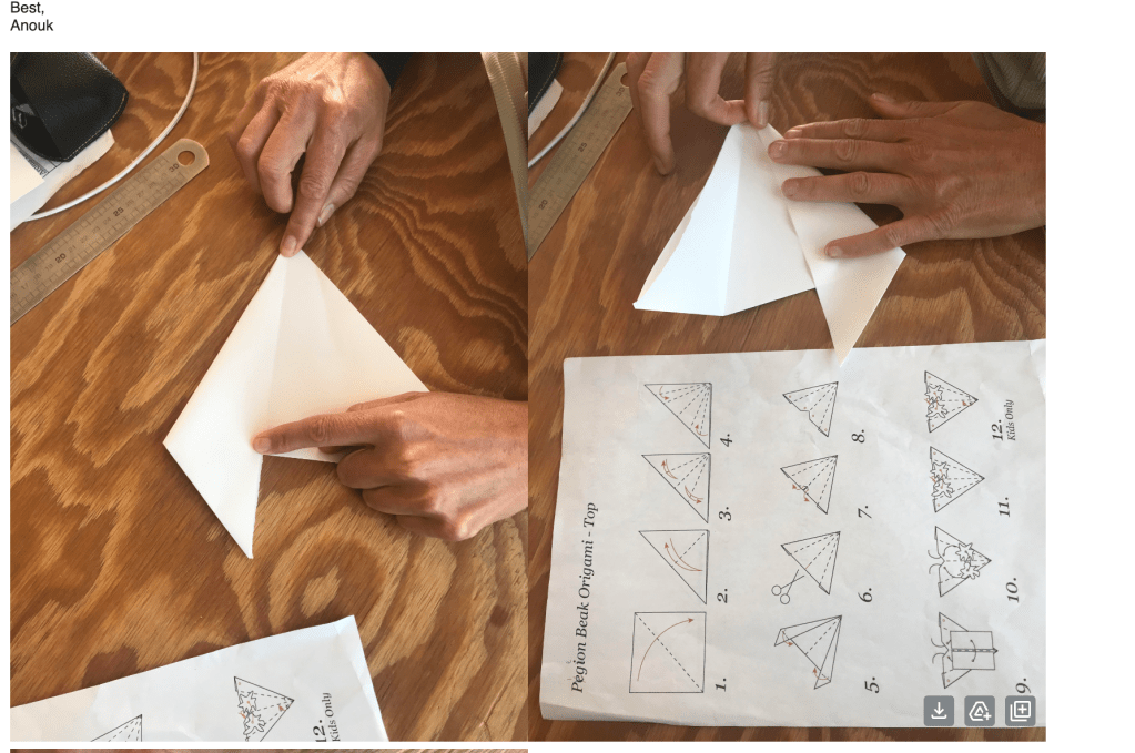 How can we think and act like pigeons? Maybe by acting like one! Hato Poppo is a simple origami pattern for human-sized pigeon beaks. Developed by me (Emma Huffman), Asuka Kondo and Mily Bogaarts for Mediamatic’s Museumnacht 2022. Read more about the event here.