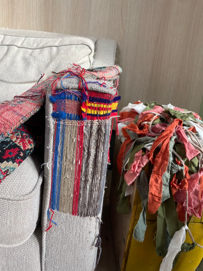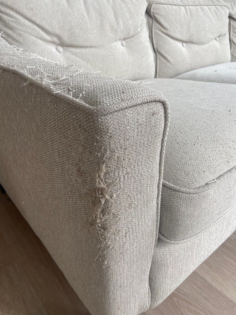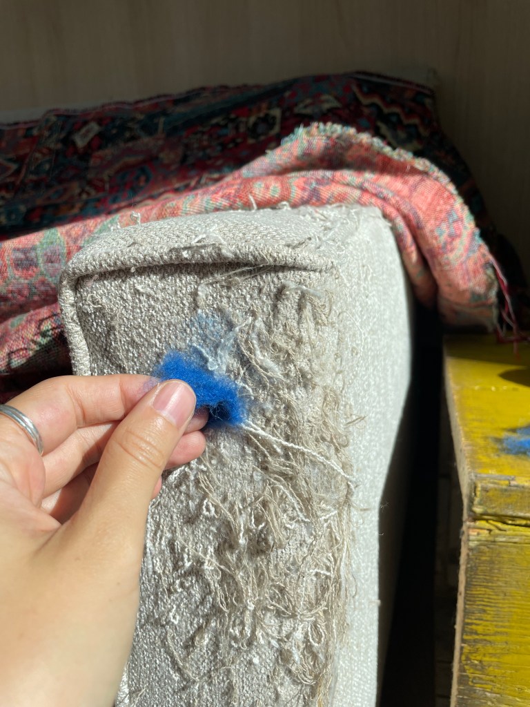C darning the Lolalijn Sofa. R watching.